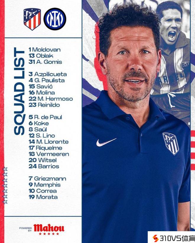 北京时间3月14日清晨4:00,2023-24赛季欧冠1/8决赛次回合,马竞将坐镇主场迎战国际米兰。赛前,马竞官方发布本场竞赛球队大名单,格列兹曼复出。