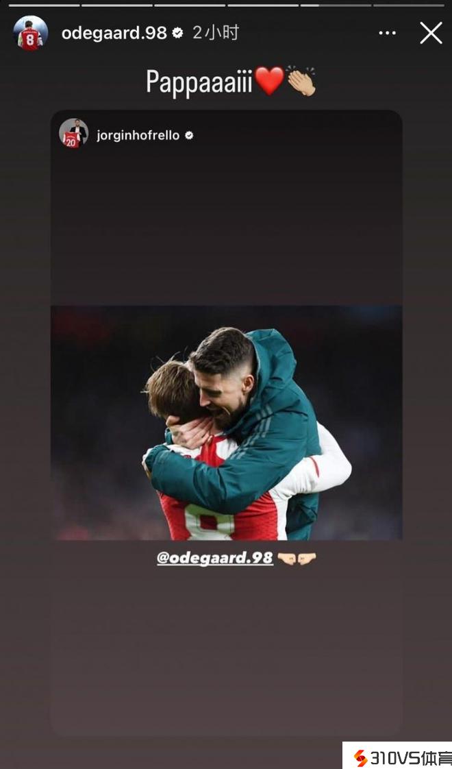 赛后,若日尼奥晒出点球大战完毕后两人相拥庆贺的照片,并@了厄德高。厄德高回复他:爸爸!❤