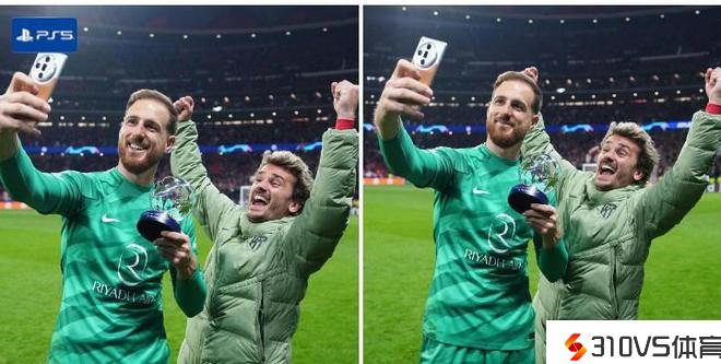 赛后奥布拉克手拿全场最佳球员的奖杯停止自拍,结果格列兹曼搞怪乱入。