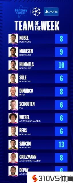 欧冠官方发布本周最佳阵容,格列兹曼、迪马尔科在列,多特6人中选。