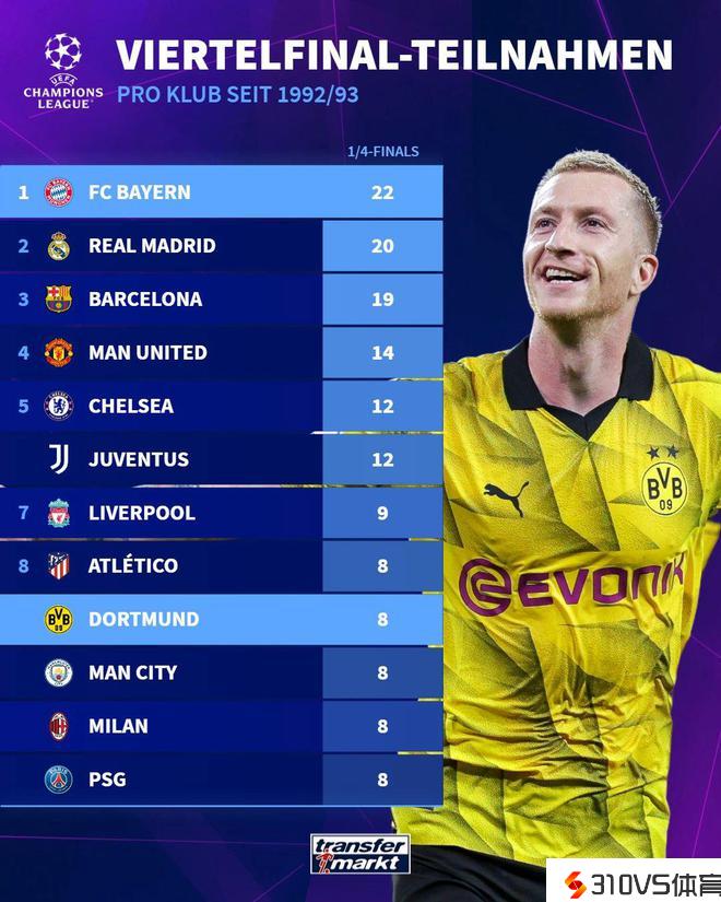 德国转会市场清点1992/1993赛季(欧冠改制)以来,各队进入1/4决赛次数的排行榜(注:1992/1993、1993/1994赛季没有1/4决赛这一阶段)。