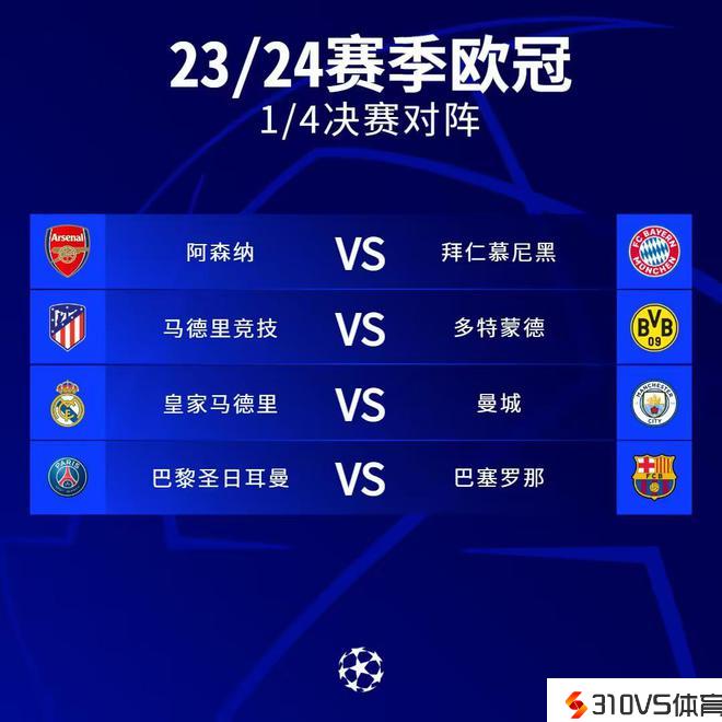 本赛季的欧冠1/4决赛抽签完毕,对阵状况如下:阿森纳vs拜仁、皇马vs曼城;马竞vs多特,巴黎vs巴萨!