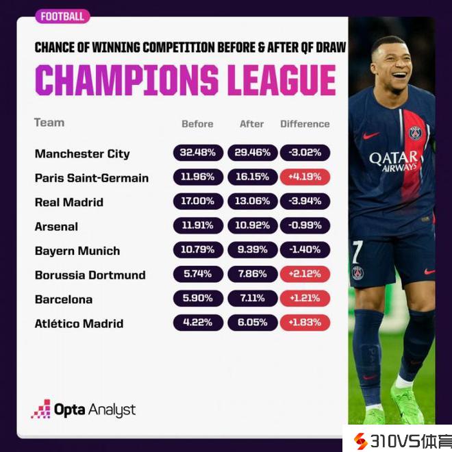 欧冠1/4决赛抽签出炉,拜仁vs阿森纳、皇马vs曼城、巴黎vs巴萨、马竞vs多特。数据网站OPTA更新欧冠夺冠概率,曼城仍位居第一,但概率从抽签之前的32.48%下降至29.46%,巴黎则反超皇马升至第二。