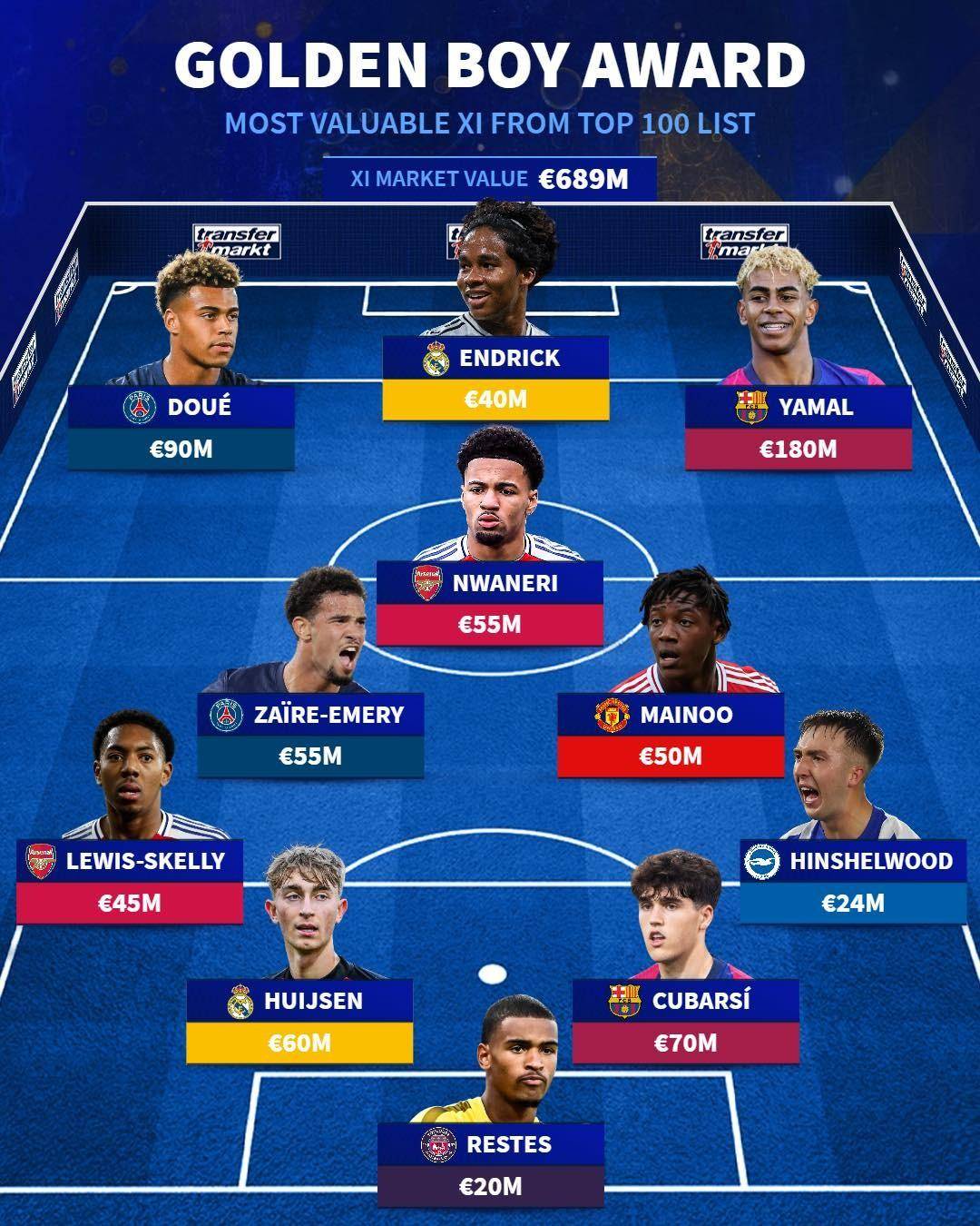 北京时间6月8日,德国《转会市场》给出了金童奖候选名单中的最贵阵容,亚马尔1.8亿欧独挑大梁,刚刚帮助大巴黎夺得欧冠并在决赛一鸣惊人的杜埃9000万欧在列。皇马新援赫伊森6000万欧,不过不及巴萨库巴西(7000万欧)。