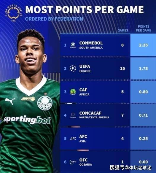 截止到目前本届世俱杯,南美洲球队场均得分高居榜首,欧洲仅排名第二,非洲球队第三,中北美洲及加勒比海地区球队第四、亚洲球队第五,大洋洲球队则是排名垫底。