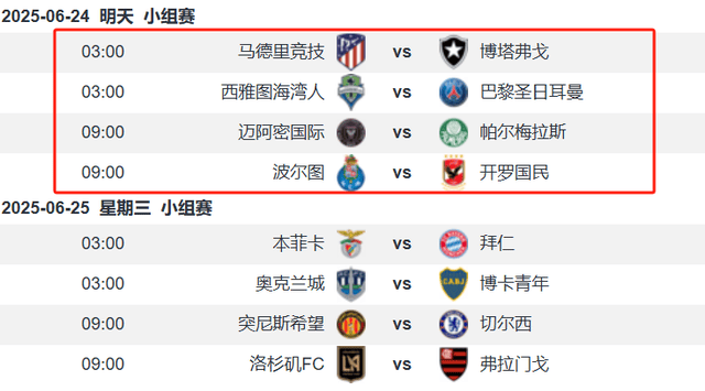 世俱杯小组赛末轮,同组两场比赛是同时开始的,之前2轮是北京时间0时、3时、6时、9时进行,如今是3时和9时进行,大家要注意看球时间。小组赛来到了收官战,进入淘汰赛之后,相信世俱杯会更加精彩,也会热度回温。