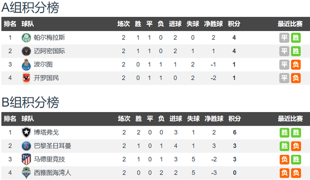下图是小组赛2轮战罢A组和B组的积分情况,4分排名第二的迈阿密国际是很有机会出线的,而3分排名第三的马竞由于净胜球的劣势,即使末轮取胜也很难出线了。