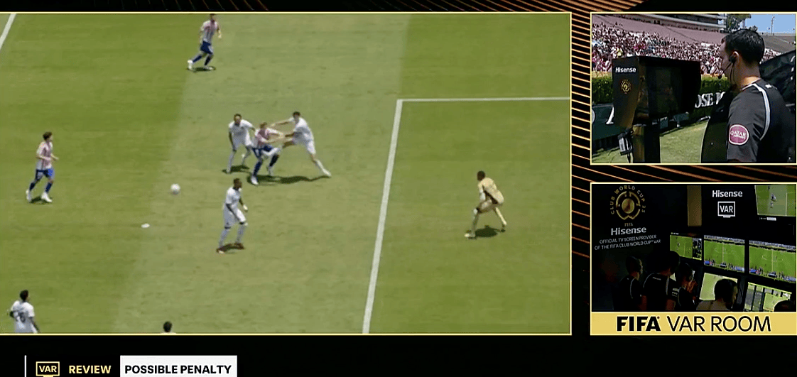 VAR介入,的确,阿尔瓦雷斯是被踢倒的。但是,在此之前,索尔洛特率先推了防守球员后,才获得的球权,依旧没有点球。