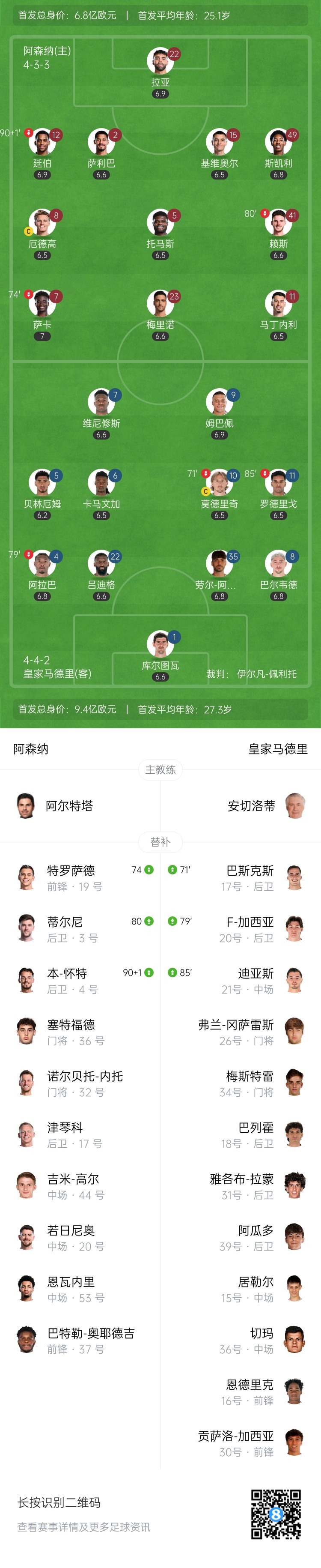 上半场伤停补时2分钟,半场结束,阿森纳暂0-0皇马。