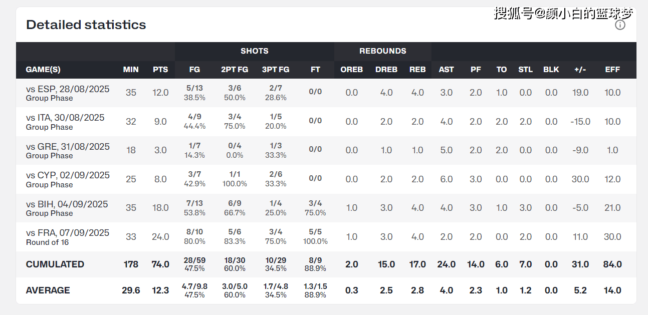 这位1.85米的小后卫对阵法国一战,33分钟,10中8,三分4中3,罚球5中5,拿到24分4篮板2助攻2抢断0失误,命中率80%,三分命中率75%,效率值30,他打出了格鲁吉亚生涯最佳一战,他帮助格鲁吉亚创造了历史。