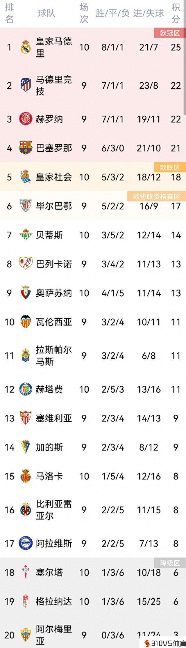 英超积分榜上,皇马仰仗8胜1平1负的战绩领跑,马竞在少赛一轮的状况下,少3分暂居第二。最新积分榜如下