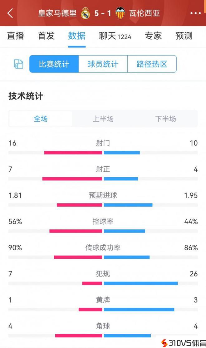 本轮西甲皇马坐镇主场5-1大胜瓦伦西亚。本场竞赛双方重点数据对比如下(皇马在前):