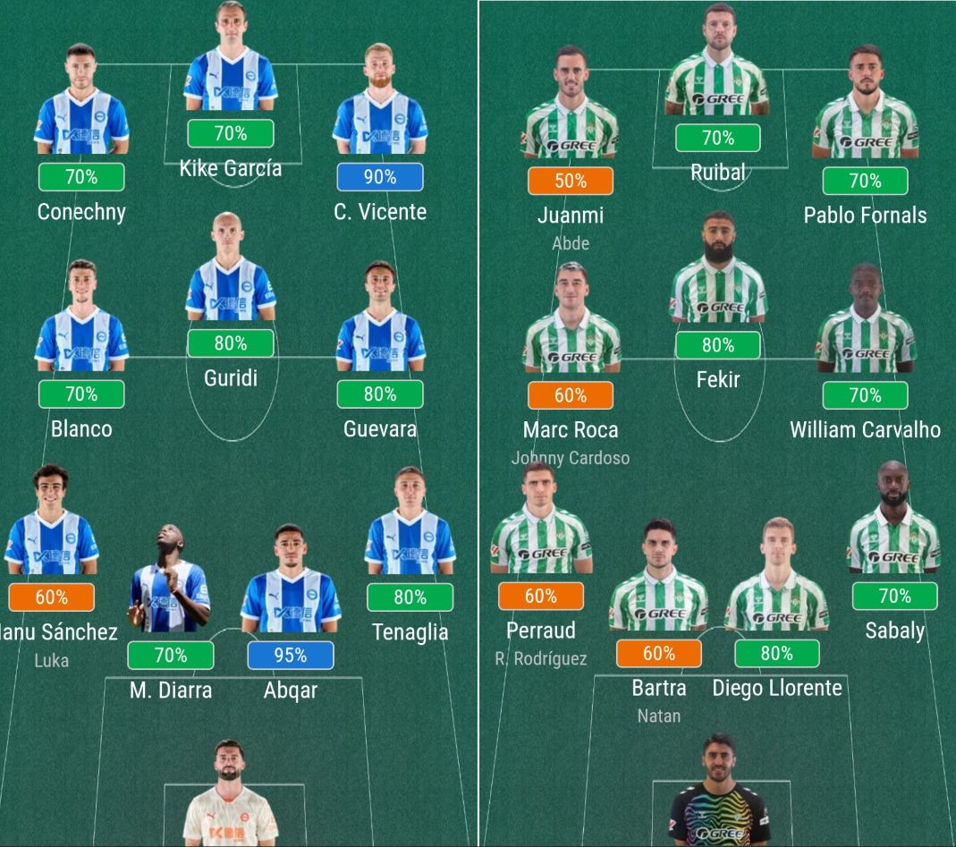 兵员方面,阿拉维斯阵容较为齐整。贝蒂斯队的前锋巴坎布(上赛季出场21场攻入3球助攻1次),伊斯科(前皇马名将,上赛季36次出场打入9球助攻7次)因为身体原因,本周训练并不系统,能否出场存疑。