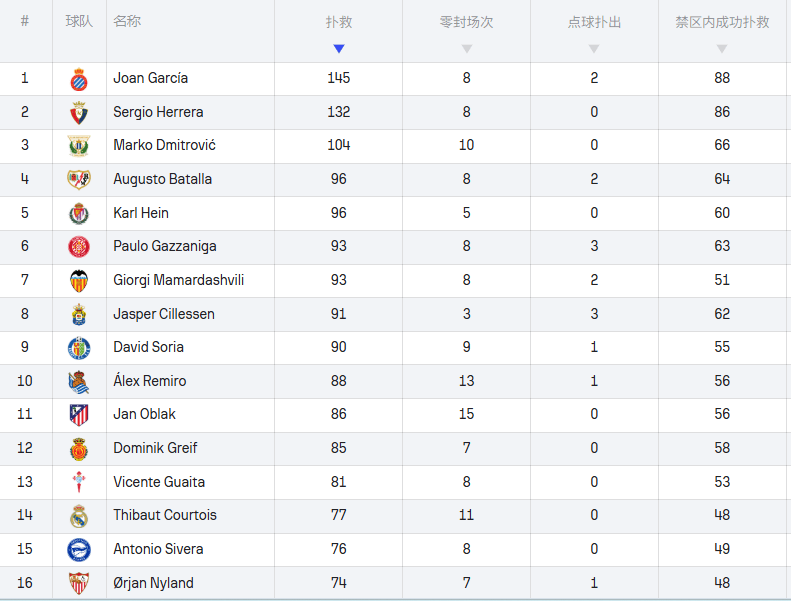 从数据上可以看到,加西亚无论是总扑救数还是禁区内扑救数,都有一定的领先优势。同时他上赛季面对7个点球,扑出了3个(1个因为队友违例无效,被吹重罚)。