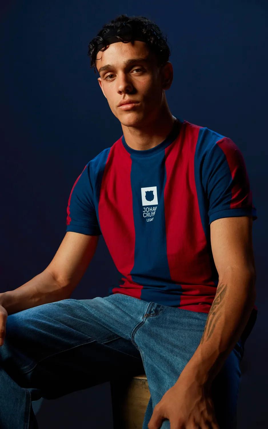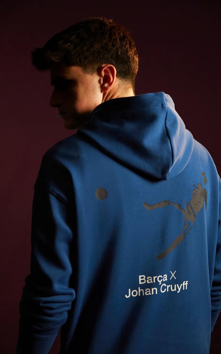 该系列包括T恤、运动衫和夹克,其设计元素唤起人们对克鲁伊夫传奇的回忆——他身穿的9号球衣、其标志性“飞翔的荷兰人”姿态再现的著名“世纪进球”剪影,以及记录他最具象征性时刻的经典照片。配色方案融合了巴萨标志性的红蓝色、黑色以及荷兰队经典的橙色。复古号码、动感图形以及简约刺绣等元素,使每一件单品都成为永恒风格的宣言。