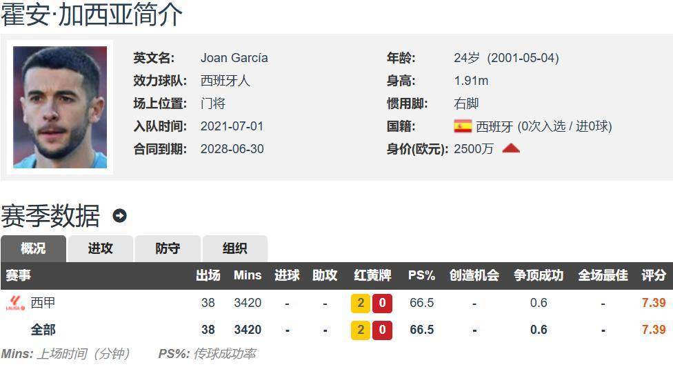现年24岁的霍安-加西亚,身高1.91米,右脚门将,与西班牙人的合同至2028年,德转估价2500万欧元。霍安-加西亚出战了上赛季全部的38场西甲的比赛,取得8场零封,丢了51球,场均丢了1.34球。