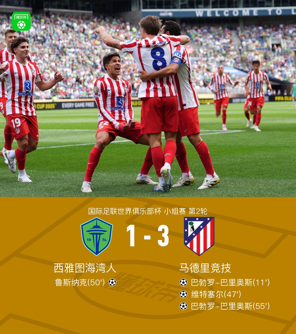 北京时间6月20日,国际足联世界俱乐部杯小组赛第2轮,西雅图海湾人与马德里竞技 较量。上半场,朱利亚诺-西蒙尼送出助攻,巴勃罗-巴里奥斯成功取得进球。朱利亚诺-西蒙尼造点被吹。下半场,勒诺尔芒助攻维特塞尔破门将比分扩大。随后鲁斯纳克破门扳回一分。瑟洛特助攻,巴里奥斯破门完成双响。赫苏斯-费雷拉越位,进球被吹无效。最终,西雅图海湾人1-3不敌马竞,成为2025世俱杯首支被淘汰的队伍。