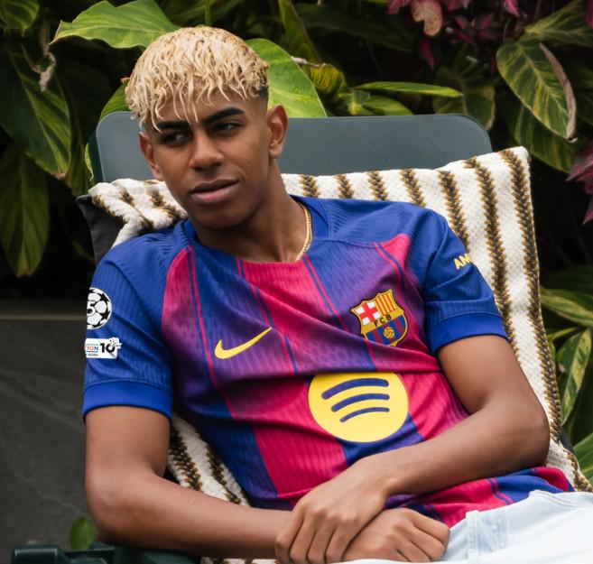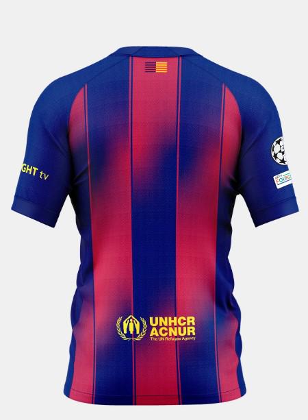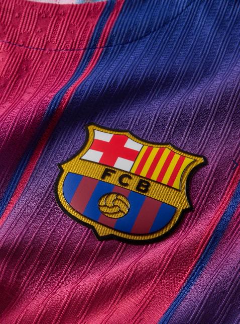 这件球衣采用了标志性的红蓝条纹设计,并在蓝色和红色条纹加入了渐变效果,赋予其现代且动感的风格,巴萨的队徽位于左侧胸前,而耐克的标志则出现在右侧。