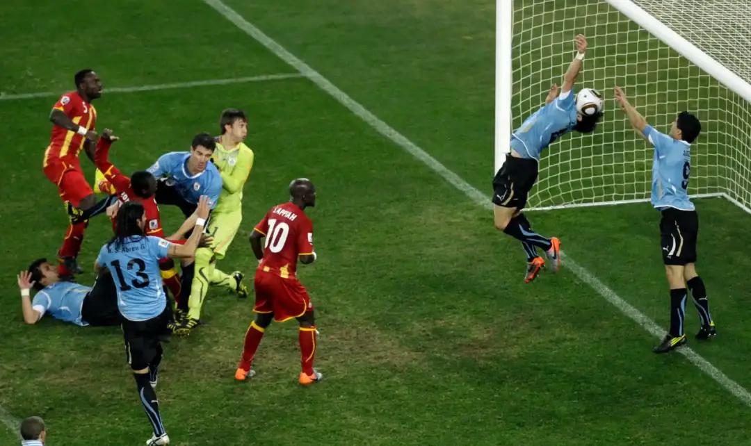 2010年7月2日,乌拉圭与加纳在1/4决赛相遇,双方常规时间1:1战平进入加时赛。加时赛第120分钟,加纳队获得绝佳进攻机会,阿皮亚的射门先是被苏亚雷斯用膝盖挡出,随后阿迪亚的头球补射直奔空门。