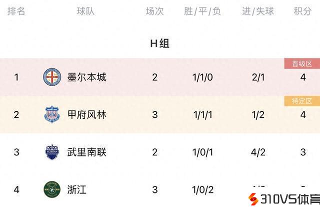 亚冠小组赛H组第三轮两场竞赛战罢,浙江2-0甲府风林、武里南联0-2墨尔本城。最新积分榜如上(武里南联0-2墨尔本城暂未更新到积分榜上)。
