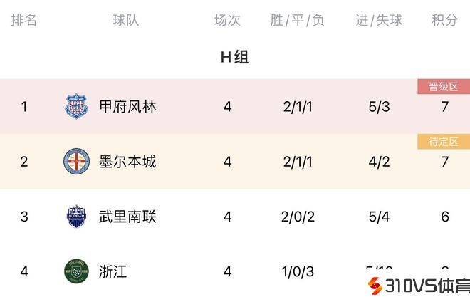 > 亚冠H组积分:J2第六甲府风林登顶,墨尔本武里南二三位,浙江垫底