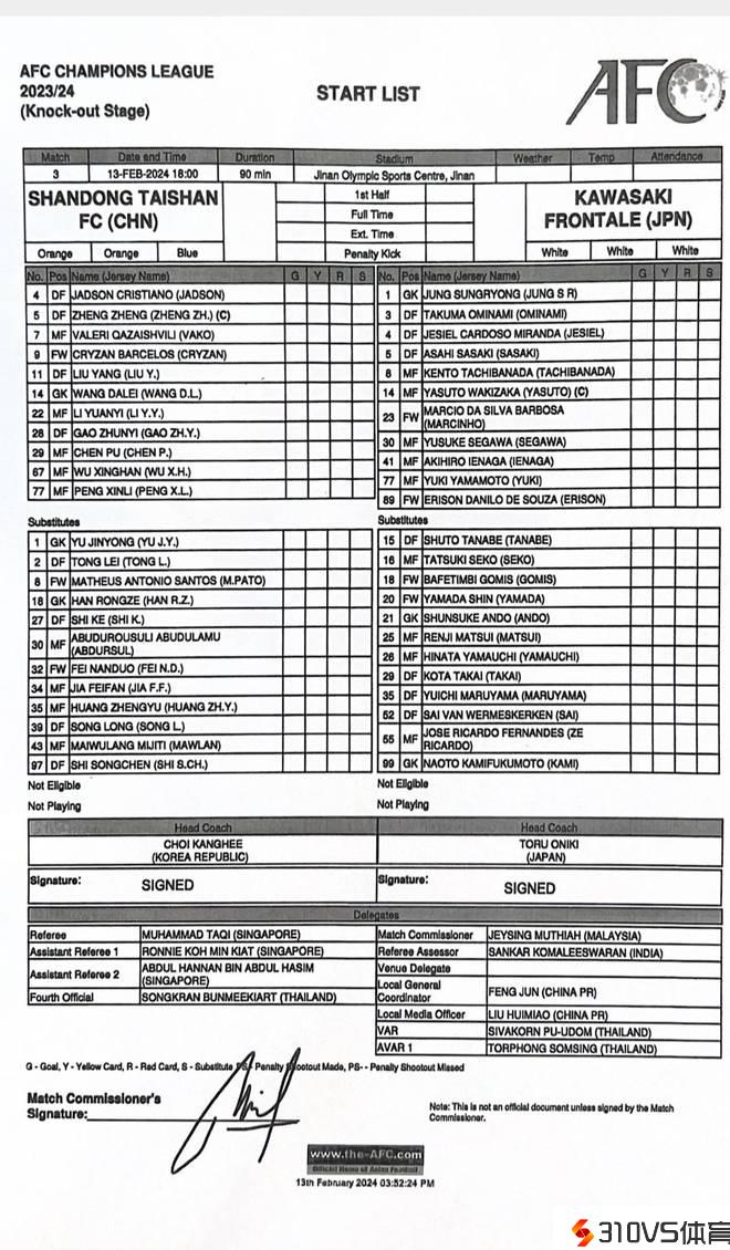 川崎前锋首发:1-郑成龙、3-大南拓磨、4-热谢尔、5-佐佐木旭、8-橘田健人、14-胁坂泰斗、77-山本悠树、23-马尔西尼奥、30-濑川祐辅、41-家长昭博、89-埃里松