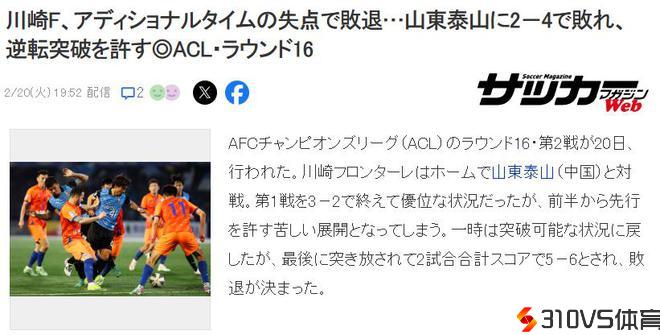 亚冠1/8决赛次回合,山东泰山4-2打败川崎前锋,总比分6-5晋级亚冠八强。赛后日本媒体《足球杂志》宣布文章,表示川崎前锋在本场竞赛中,无法遏制泰山队弱小的进攻。