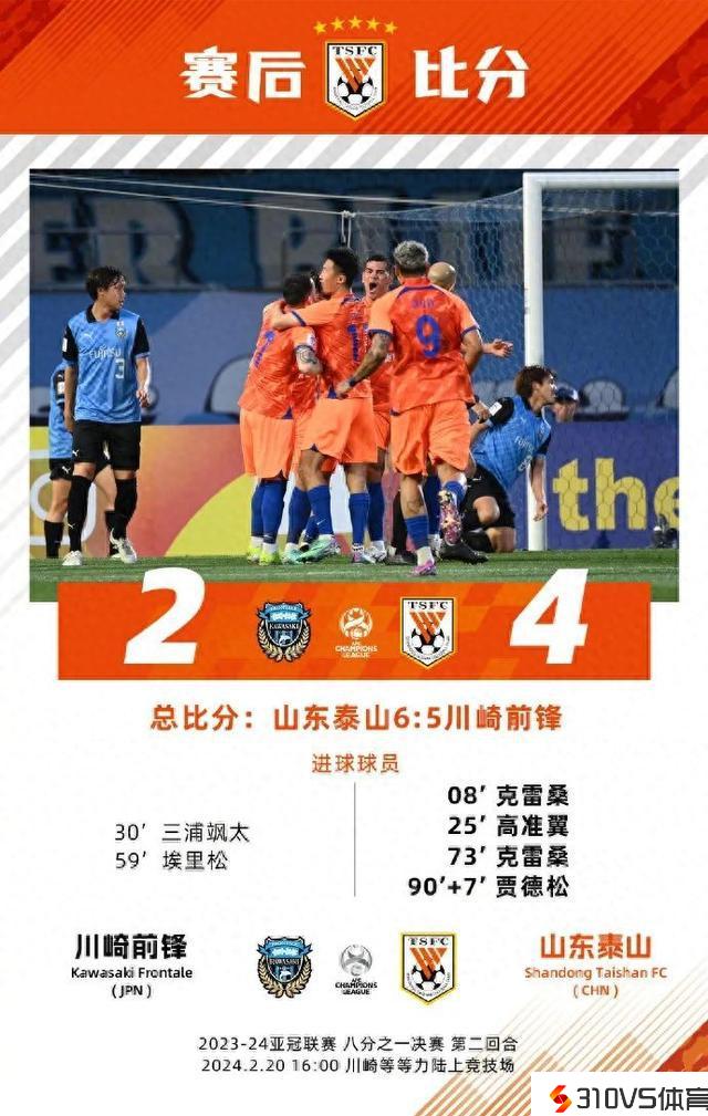 第73分钟,克雷桑禁区外劲射协助山东泰山扳平总比分。补时最后时辰,贾德松禁区内转身抽射,山东泰山总比分6:5绝杀淘汰对手,挺进亚冠8强。