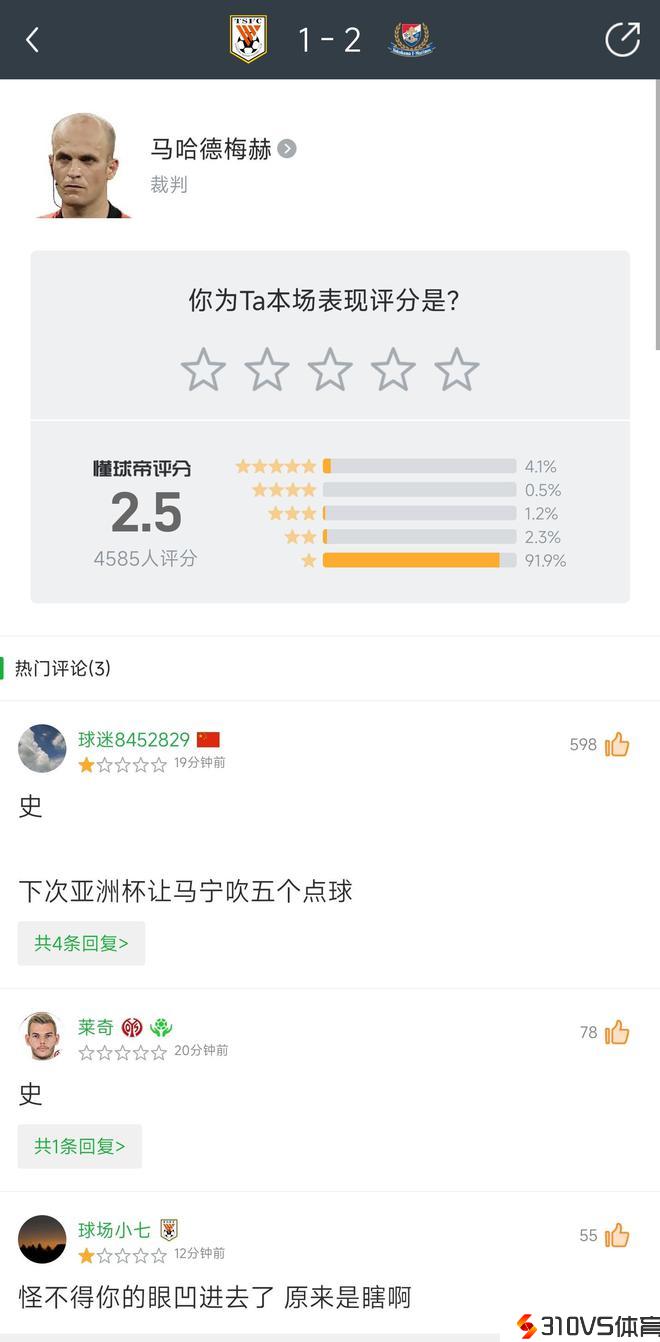 > 我懂球迷对山东vs横滨水手主裁评分仅为2.5,92%球迷给出一星