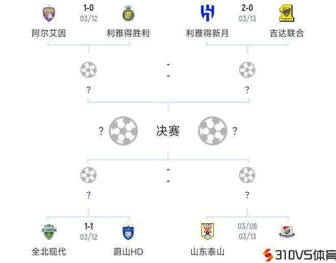 亚冠1/4决赛首回合全部战罢,其中西亚区赛果阿尔艾因1-0利雅得成功,利雅得新月2-0吉达结合;东亚区全北现代1-1蔚山HD,山东泰山1-2横滨水手。