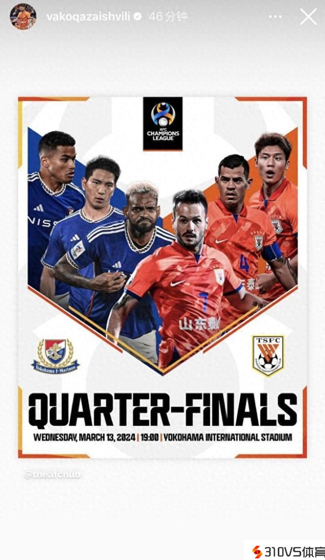 3月13日讯 明天半夜,泰山外援卡扎伊什维利更新社媒,发布了亚冠1/4决赛次回合的竞赛海报。
