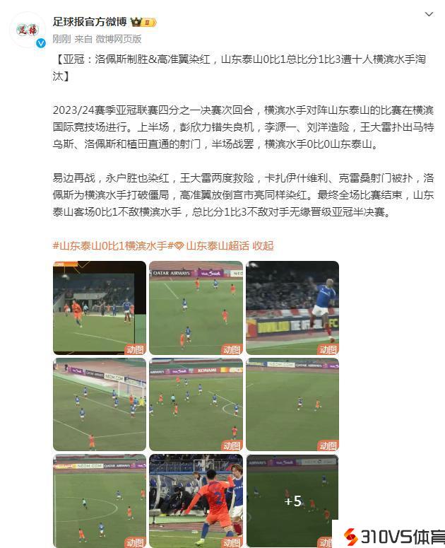易边再战,永户胜也染红,王大雷两度救险,卡扎伊什维利、克雷桑射门被扑,洛佩斯为横滨水手打破僵局,高准翼放倒宫市亮异样染红。最终全场竞赛完毕,山东泰山客场0比1不敌横滨水手,总比分1比3不友好手无缘晋级亚冠半决赛。