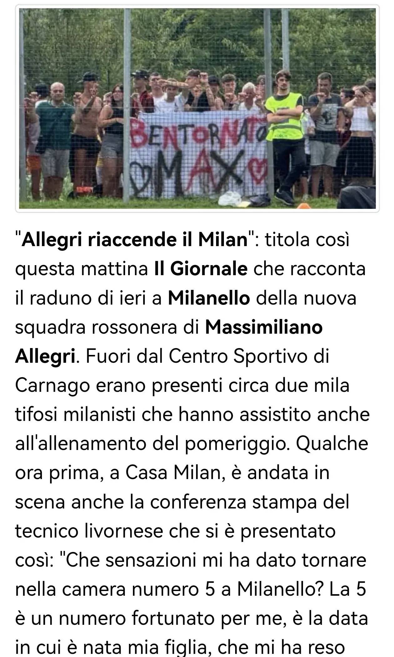 约两千名米兰球迷来到卡尔纳戈体育中心外,观看了下午的训练。几小时前,这位利沃诺籍教练在米兰之家出席了新闻发布会,他是这样介绍自己的
