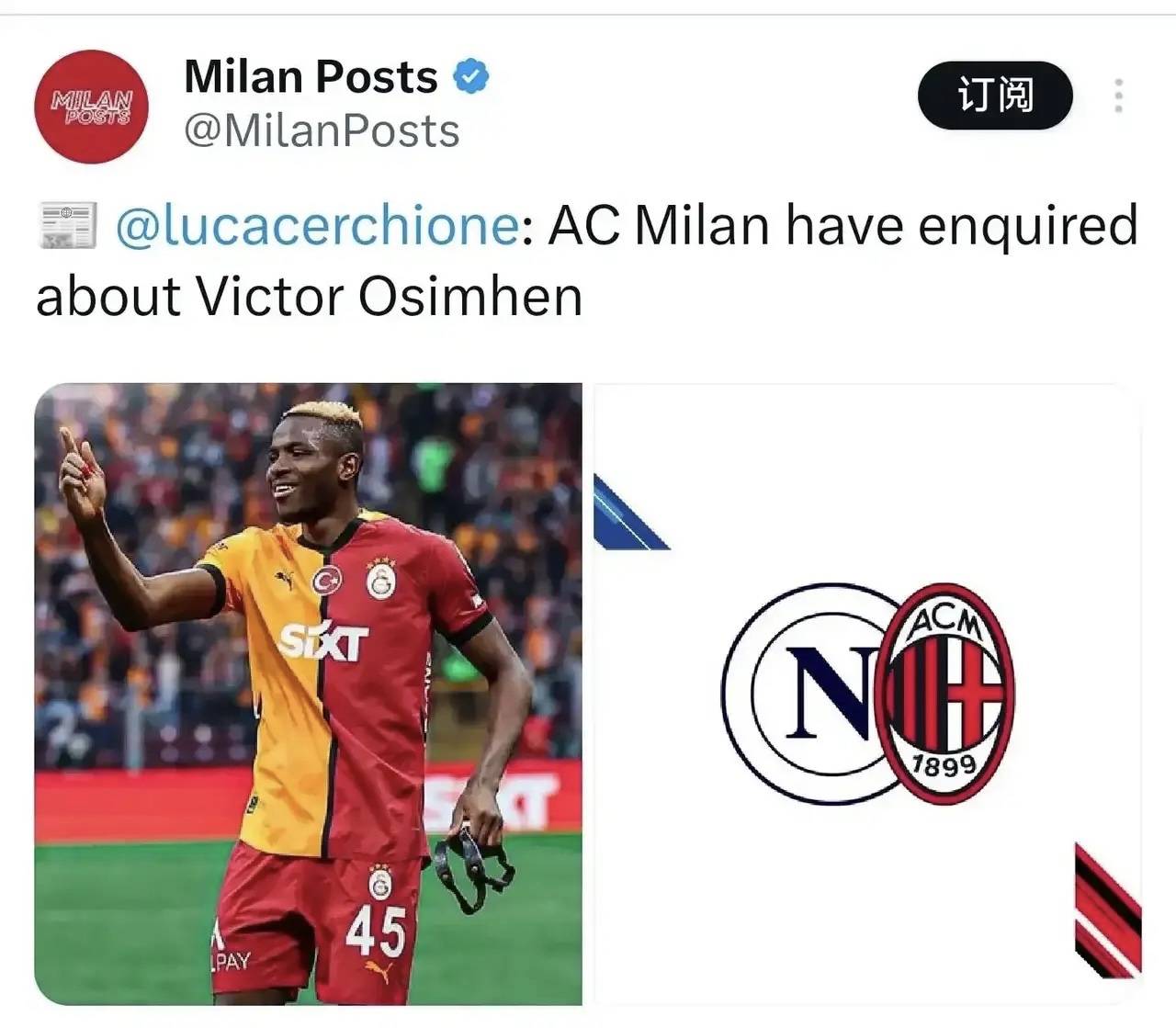 奥斯梅恩!米兰询问了奥斯梅恩情况,这是米兰第四次与奥斯梅恩经纪人取得接触,米兰希望奥斯梅恩可以降低工资需求。米兰的中场基本稳定了,后面就是两个边后卫与锋线球员,肯定是消息满天飞,但奥斯梅恩并不是没有可能,奥斯梅恩在英超没有获得认可,理由是职业态度不行。