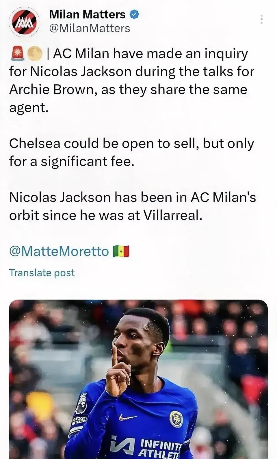 尼古拉斯·杰克逊是切尔西愿意出售的球员,但前提是要支付一笔可观的费用。自从尼古拉斯·杰克逊效力于比利亚雷亚尔时起,他就一直处于AC米兰的关注范围内。如果最后是尼古拉斯·杰克逊,那我不理解为啥看不上尼古拉斯·杰克逊的加强版亚伯拉罕,至少现在亚伯拉罕比尼古拉斯·杰克逊要强。解释下这个一直在米兰关注范围内,不仅仅是关注范围,应该说要不是切尔西截胡前年就买了,当时米兰谈判已经非常深入了。