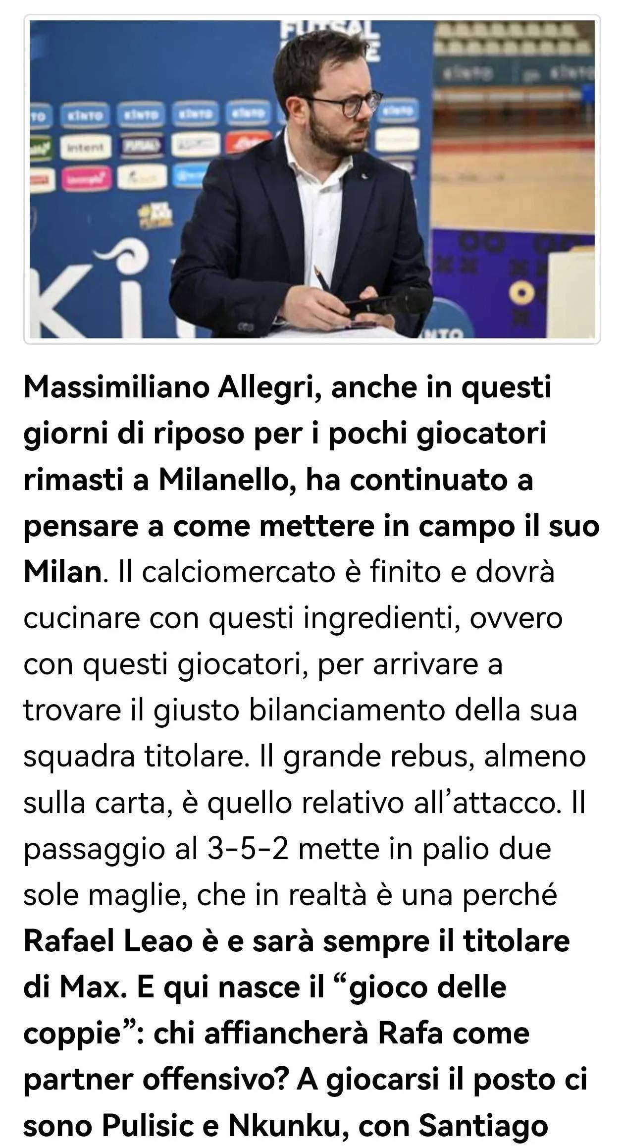 转型3-5-2阵型后,锋线仅设两个名额——但实际上相当于一个,因为拉斐尔·莱奥始终是阿莱格里心中的绝对主力。由此便产生了“搭档之争”:谁会成为莱奥的锋线伙伴?普利希奇和恩昆库正竞争这一位置,而圣地亚哥·希门尼斯则在阵容层级中处于劣势。