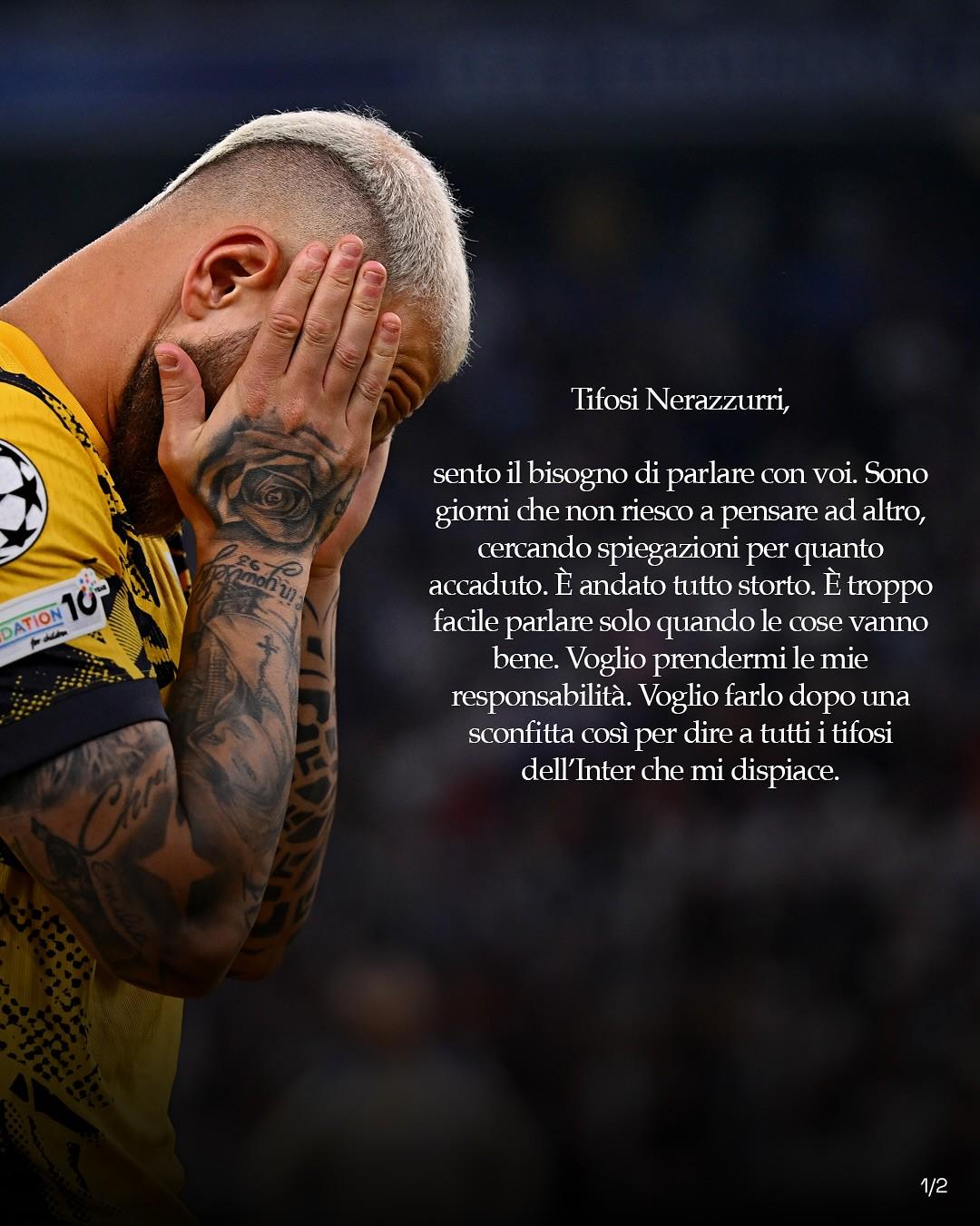 我觉得有必要和你们聊聊。这些日子以来,我满脑子都在想这件事,试图为所发生的一切寻找解释。一切都搞砸了,只在事情顺利的时候发声太容易了。而我想要承担起自己的责任,我想在这样一场失利后这么做,所以我在此向所有国际米兰球迷说一声:抱歉。