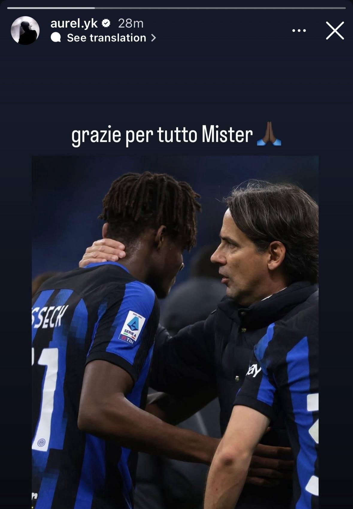 在国际米兰官方确认主帅西蒙尼-因扎吉离任后,国米后卫比塞克在社交媒体告别恩师。