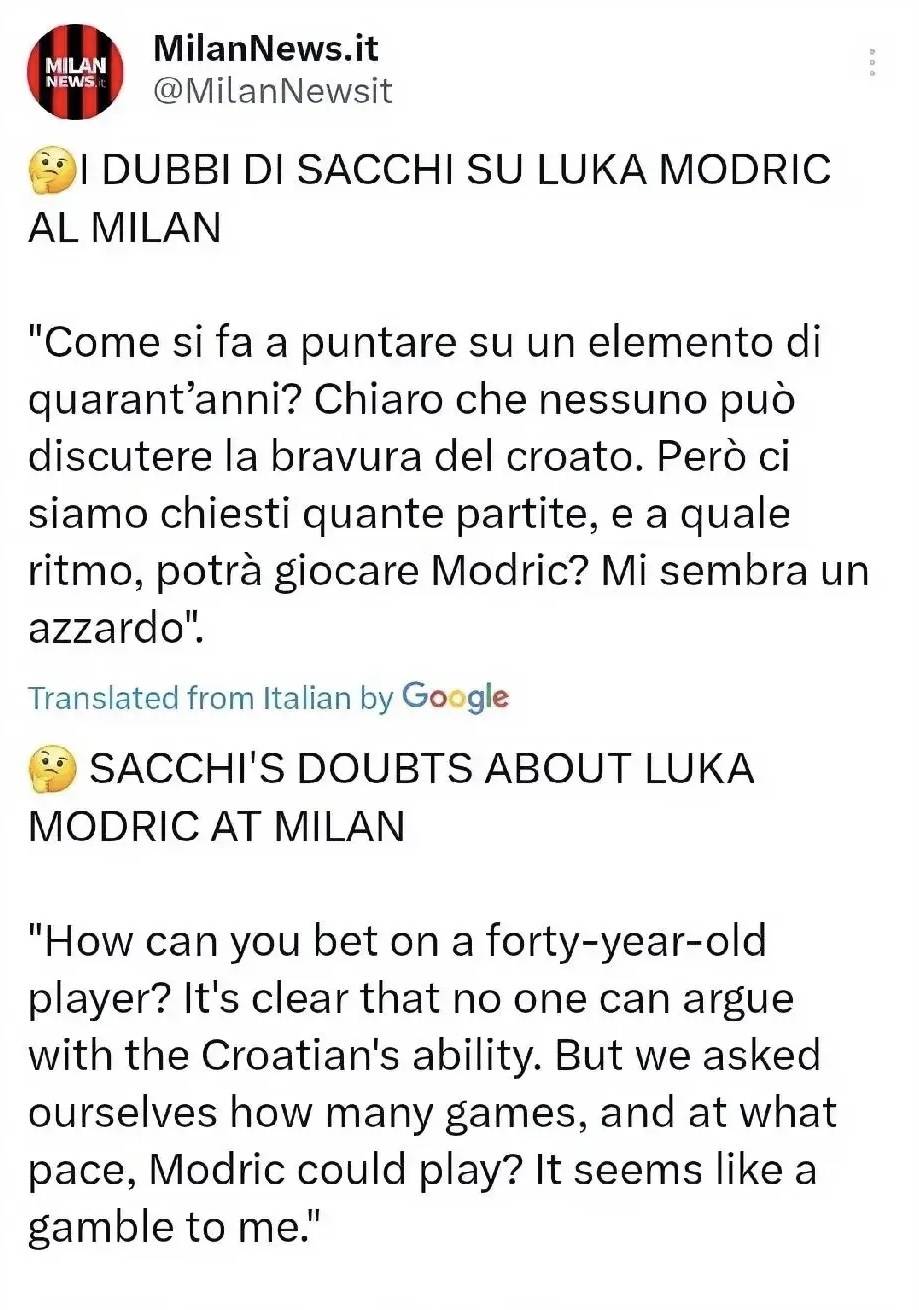 薩基并不看好莫德里奇加盟米兰。薩基说怎么能指望一个四十岁的人呢?克罗地亚人的能力当然无可置疑。但是我们要问的是莫德里奇还能踢多少场比赛?还能保持什么样的节奏?在我看来,这是一场赌博。