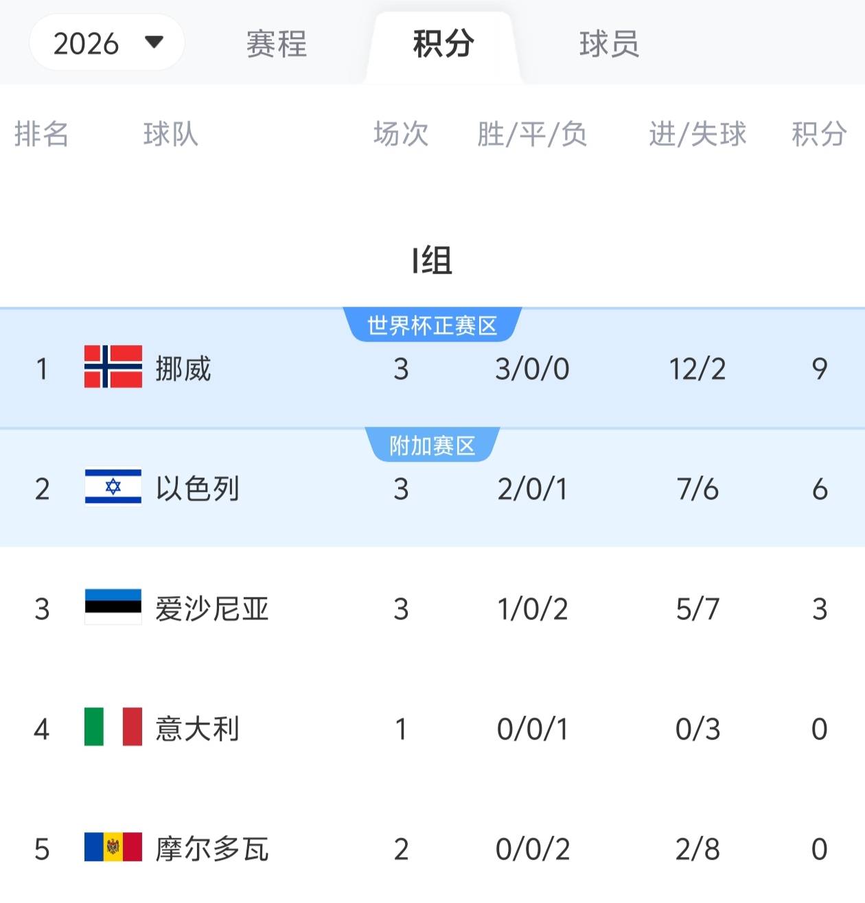挪威队前三轮5比0胜摩尔多瓦队、4比2客场胜以色列队、3比0主场胜意大利队,由于这组的爱沙尼亚和摩尔多瓦特别弱,竞争前三,基本就是挪威、意大利和以色列,挪威队只要主场再战胜以色列队(大概率),那么它后面唯一真正难的一场就是最后一轮客场打意大利队,前面非常可能取得7连胜。