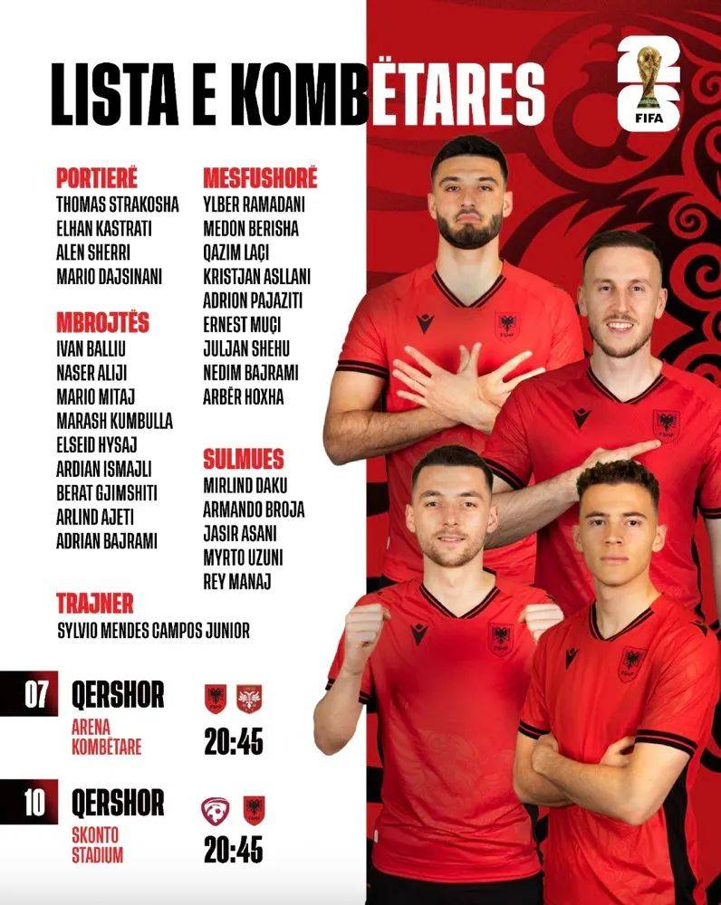 阿尔巴尼亚本次大名单缺少了赫根门将贝里沙和草蜢后卫阿布拉什,两人均已经到了职业生涯暮年。切尔西租借至埃弗顿的Armando Broja、光州FC前锋阿萨尼、乌祖尼、马纳伊、国际米兰中场阿斯拉尼、莱切双杰拉马达尼和贝里沙、罗马租借至西班牙人的中卫库姆布拉、亚特兰大中卫兼阿尔巴尼亚队长Berat Gjimshiti、拉齐奥后卫兼副队长Elseid Hysaj和恩波利后卫Ardian Ismajli均榜上有名。马纳伊缺席了前几天的训练但已经在周四复出,可以出场。
