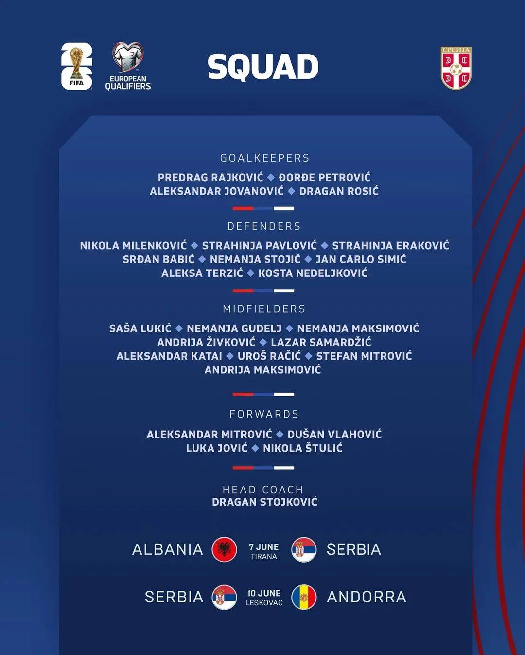 塞尔维亚在去年的欧洲杯中表现不佳,他们输给了英格兰,战平斯洛文尼亚和丹麦小组出局。欧洲杯原本可能离职的主帅斯托伊科维奇继续带队,最终他带队获得小组第三,在和奥地利的升降级附加赛中主场击败对手,继续留在A级联赛。塞尔维亚本次大名单缺少了吉达联合门将拉伊科维奇,他是塞尔维亚的队长,丘卡里察门将Lazar Kalicanin因此得以首次入选。米特洛维奇本赛季饱受伤病困扰但依然入选,他本赛季出场23次打入19球。意甲最佳门将斯维拉尔没有被征召,因为球员暂时不想为塞尔维亚效力。米林科维奇萨维奇同样落选,他表示还未做好重返国家队的准备。
