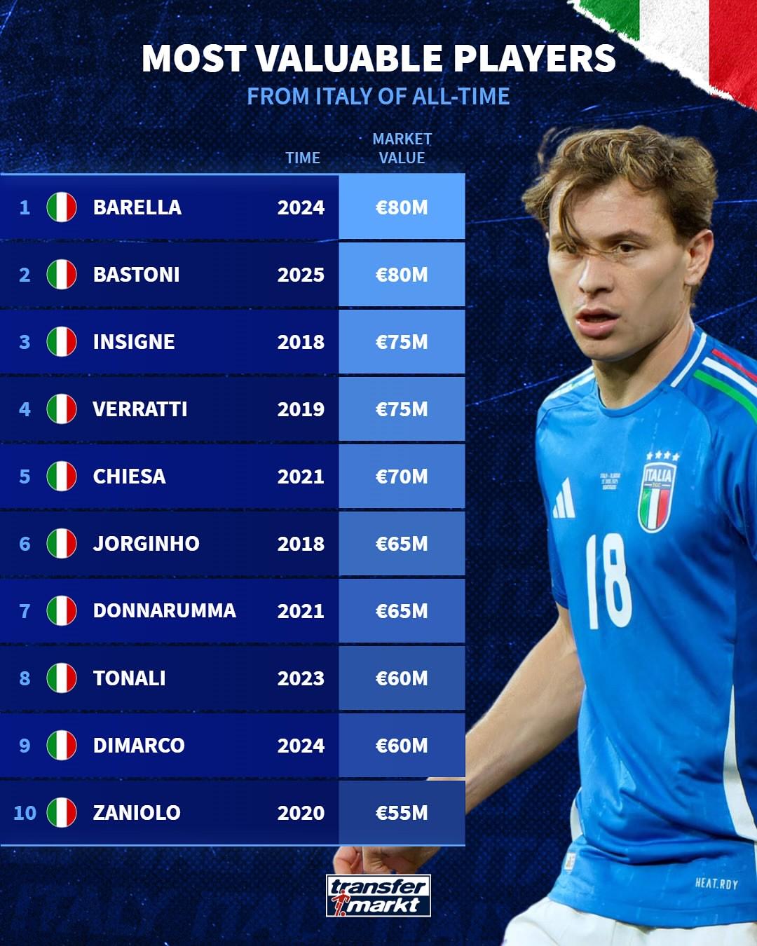 北京时间6月7日,德国转会市场列出了意大利历史身价最高球员前十位,巴雷拉、巴斯托尼8000万欧元领衔,因西涅紧随其后。
