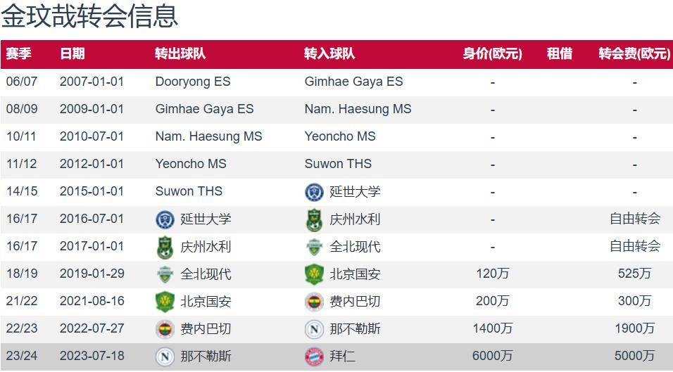 金玟哉曾在北京国安踢过球,之后转战土超费内巴切,发挥出色,一个赛季后就转战意甲加盟那不勒斯,首个赛季就成为意甲赛季最佳后卫。金玟哉于2023年夏窗以5000万欧元的转会费从那不勒斯转投拜仁,但发挥不稳定,偶尔会出错送礼。