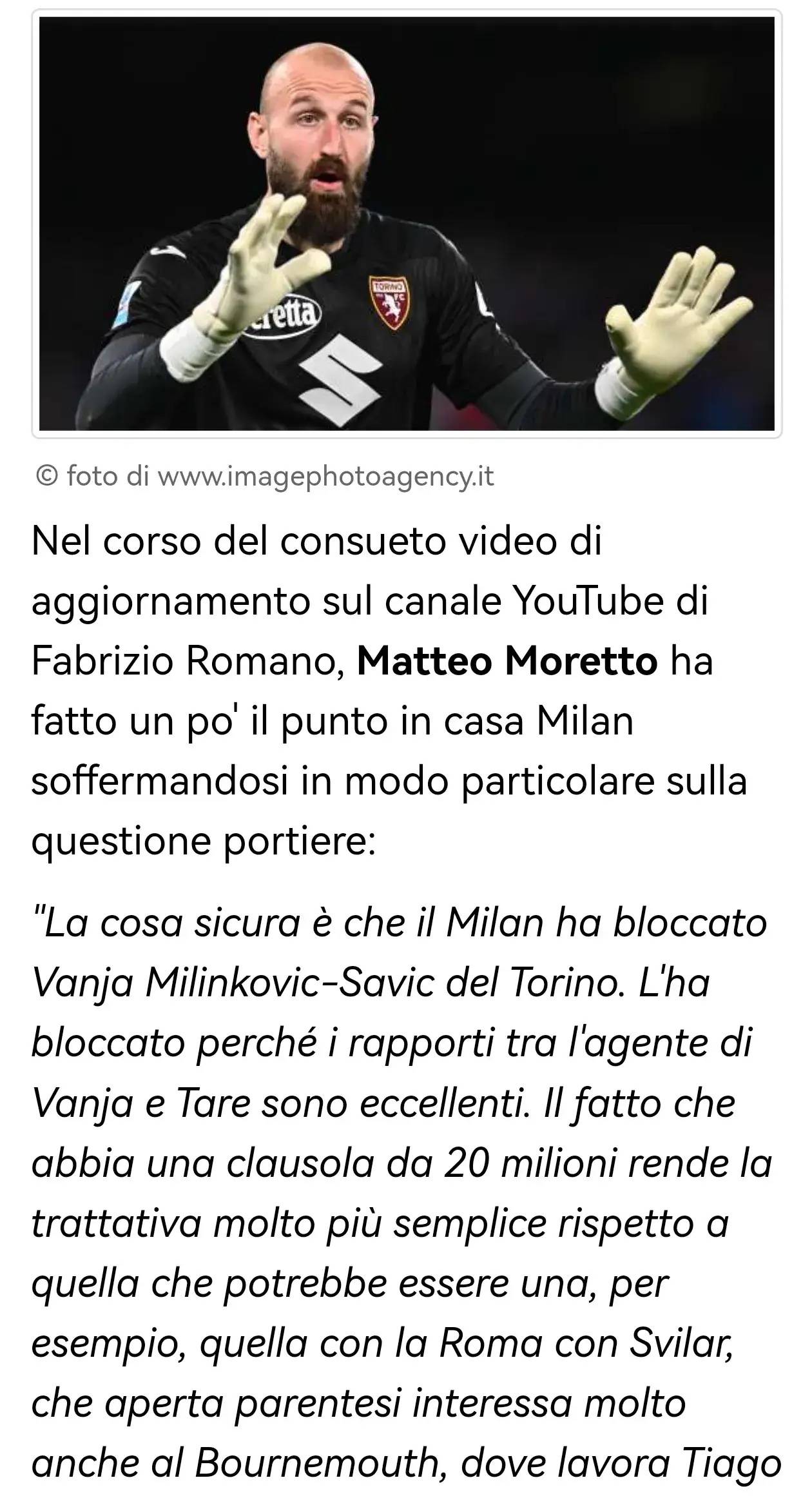 "米兰已锁定都灵门将万亚·米林科维奇-萨维奇。由于其经纪人与体育总监塔雷关系密切,且合同含2000万欧元解约条款,谈判难度远低于罗马的斯维拉尔(伯恩茅斯也在关注,其总监平托曾效力罗马)。
