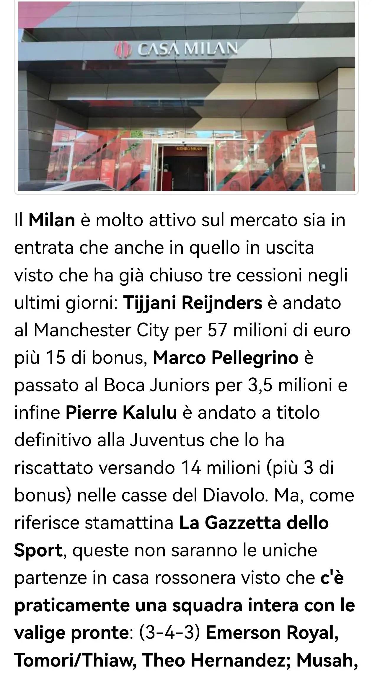 米兰在转会市场上异常活跃,近几日已完成三笔出售交易:蒂亚尼·赖恩德斯以5700万欧元加1500万欧元浮动条款加盟曼城,马尔科·佩莱格里诺以350万欧元转会博卡青年,皮埃尔·卡卢卢则被尤文以1400万欧元(含300万浮动)正式买断。