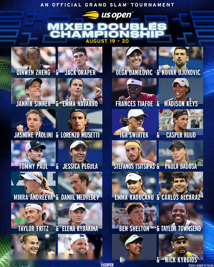 北京时间6月17日,本赛季美网混双参赛名单公布,郑钦文将搭档德雷珀出战。德约搭档达尼诺维奇,阿尔卡拉斯搭档拉杜卡努,辛纳搭档纳瓦罗。