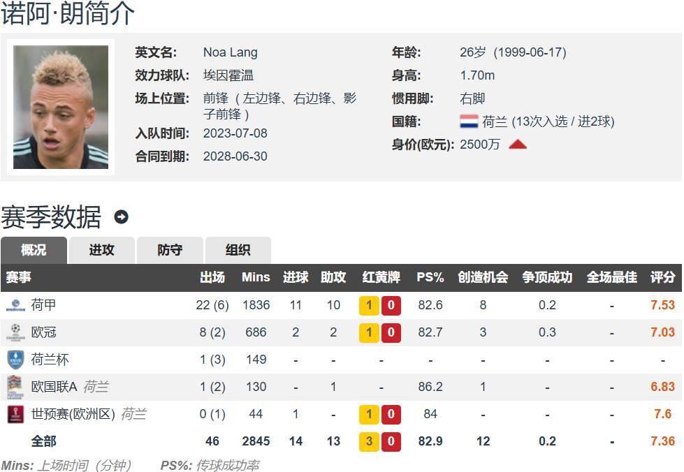现年25岁的诺阿-朗,身高1.70米,右脚球员,主打左边锋位置,与埃因霍温的合同至2028年。诺阿-朗上赛季各项赛事共为埃因霍温出场44次,其中33次首发,合计出场2804分钟,贡献14球12助,准两双数据。那不勒斯放弃桑乔之后,转攻诺阿-朗,这会是更加务实的选择。