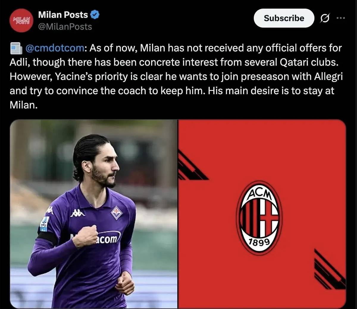 阿德利拒绝球队报价,他想留在米兰,他希望向阿莱格里证明自己的能力。前天卡塔尔俱乐部与英超俱乐部都表达了对阿德利的兴趣,今天阿德利没有通过经纪人,而是自己表达了对这个事情看法,他拒绝了来自其他俱乐部的报价,阿德利表示他希望留在米兰证明自己。