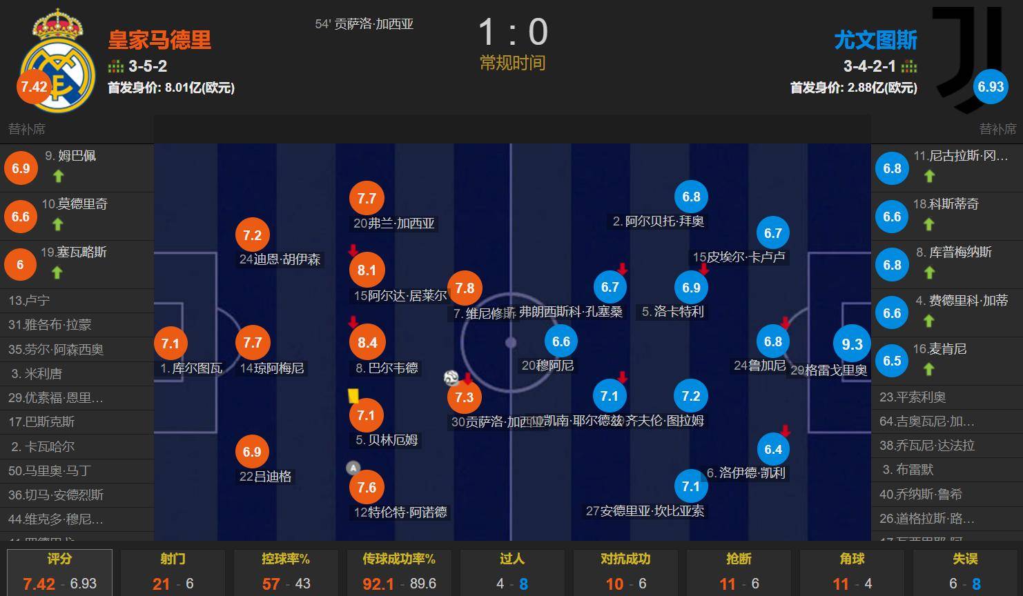 全场比赛,皇马的控球率为57%,一共有21次射门,其中11次射正;尤文图斯一共有6次射门,其中2次射正。